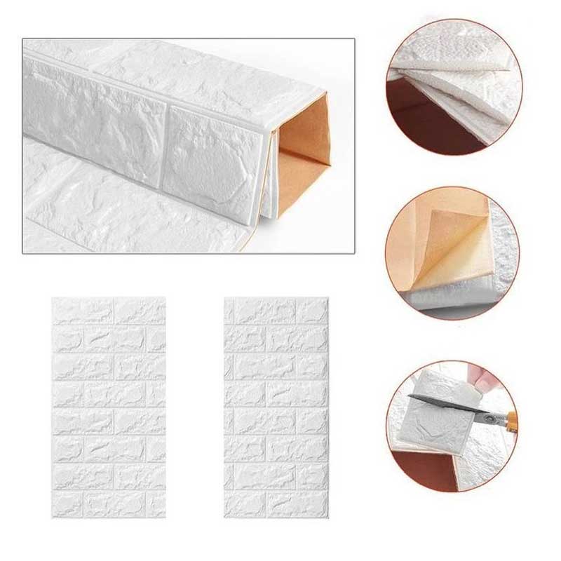 دیوارپوش فومی طرح آجر سفید پشت چسب دار یک نوع پوشش دیواری است که از فوم پلی اتیلن، پی وی سی یا فوم های دیگر تولید می شود و ابعاد هر پنل دیوارپوش فومی ۷۰ در ۷۷ است و قدرت چسبندگی بسیار بالایی دارد.