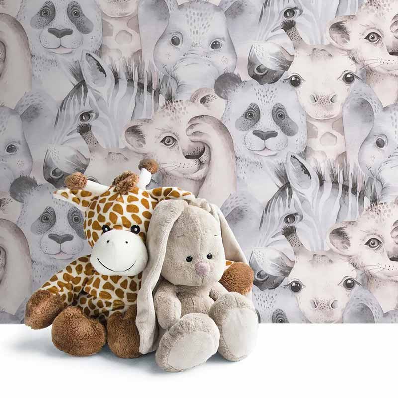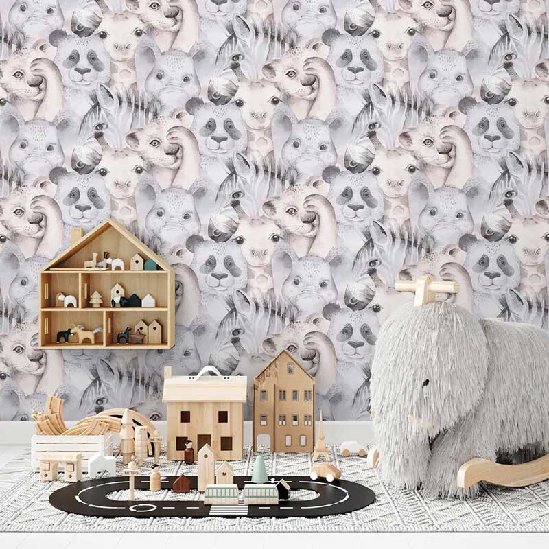 کاغذدیواری کودک طرح حیوانات | کرم / خاکستری کد 12029